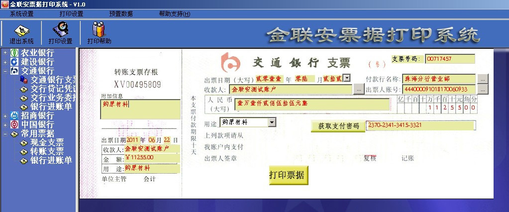 票据支付的五大要素如金额、出票时间等内容是由银行客户填写的,针对银行票据种类繁多、难于填写的问题,金联安公司自主研发出银行票据排版打印软件(签票通™),可以和支付密码计算器或网银令牌联机计算,能高效、安全地以打印方式填写各类票据,并结合具体业务广泛应用。软件可应用于金融机构及各类企事业单位的财务部门。